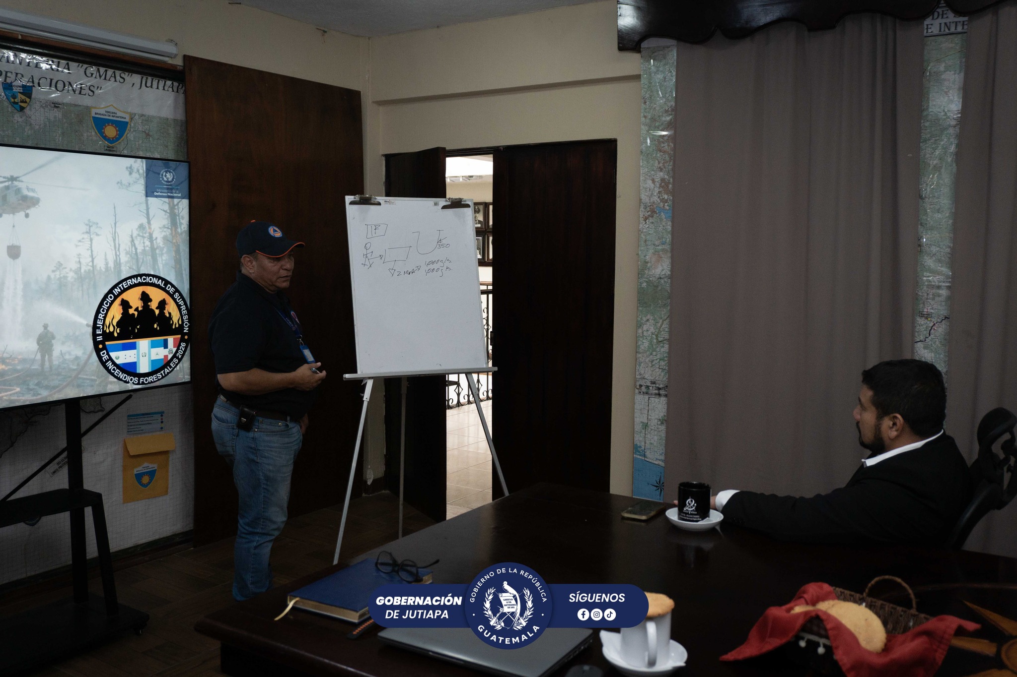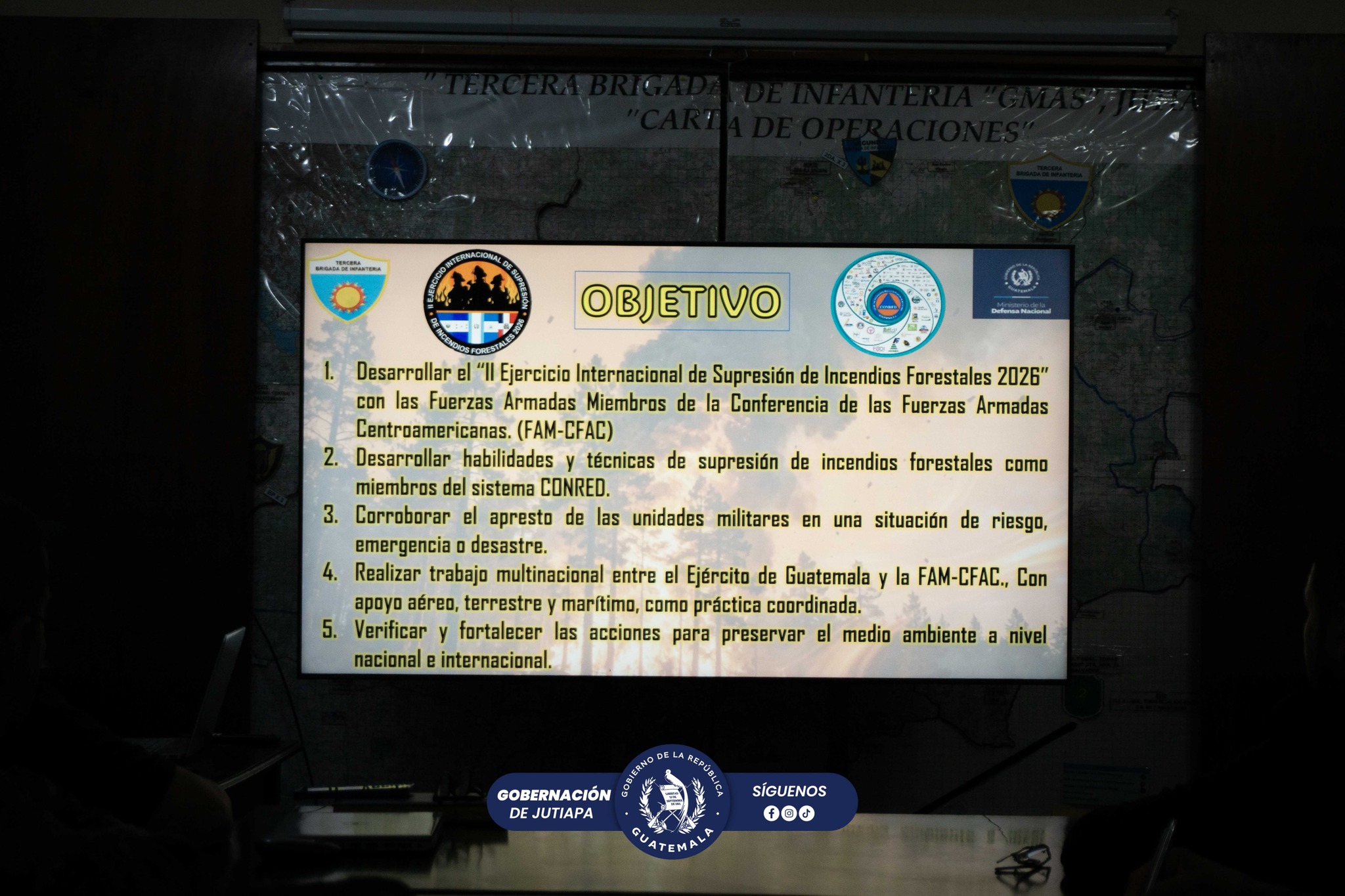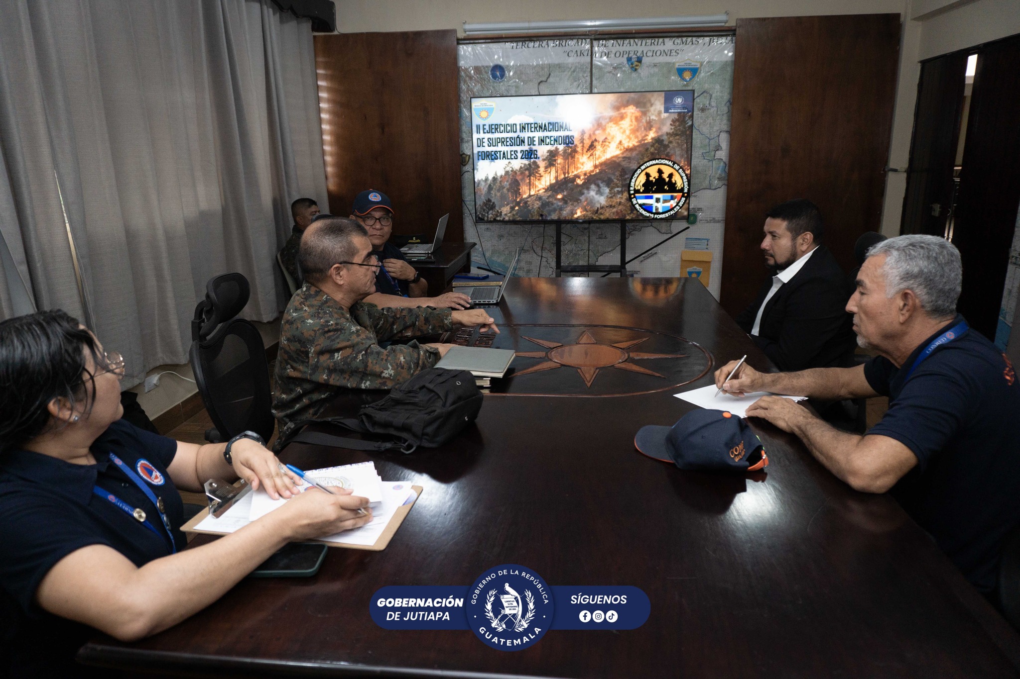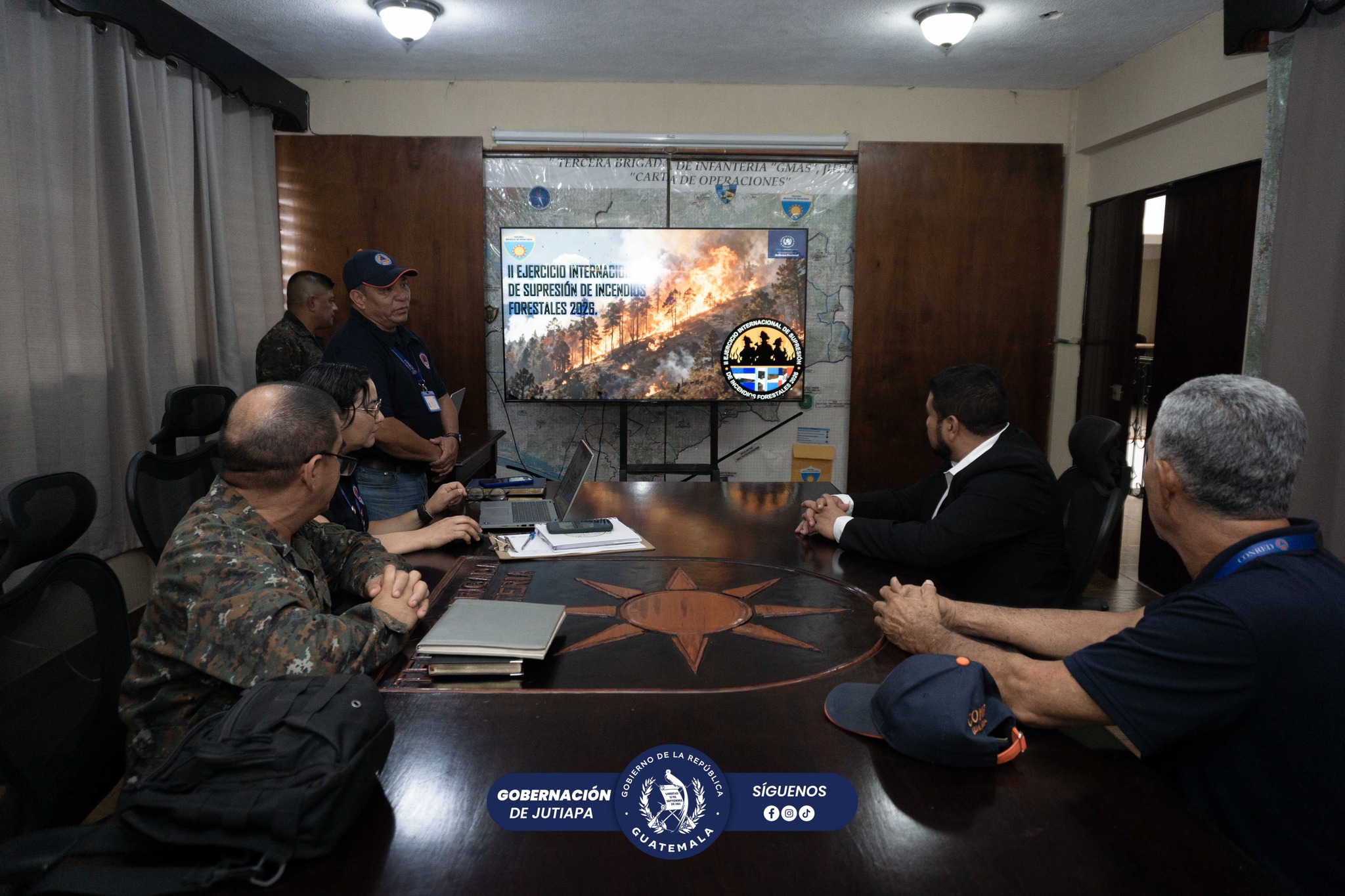 #Jutiapa El señor Gobernador Departamental de Jutiapa, Lic. Milton Sarceño, participó en la reunión con la 3ra. Brigada de Infantería y CONRED para coordinar acciones relacionadas con el Segundo Ejercicio Internacional de Supresión de Incendios Forestales 2026. Durante el encuentro se revisaron estrategias para enfrentar la creciente provocación de incendios en el departamento y fortalecer la respuesta interinstitucional.