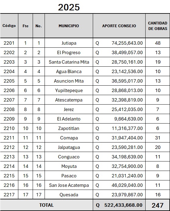 La señora Gobernadora y Presidenta del Consejo Departamental de Desarrollo (CODEDE), Diana Herrera Zepeda, indicó que el Gobierno del Presidente Constitucional de la República de Guatemala, Dr. Bernardo Arévalo de León, ha destinado Q522,433,668.00 a los municipios del departamento de Jutiapa para la ejecución de obras estratégicas durante el presente año.