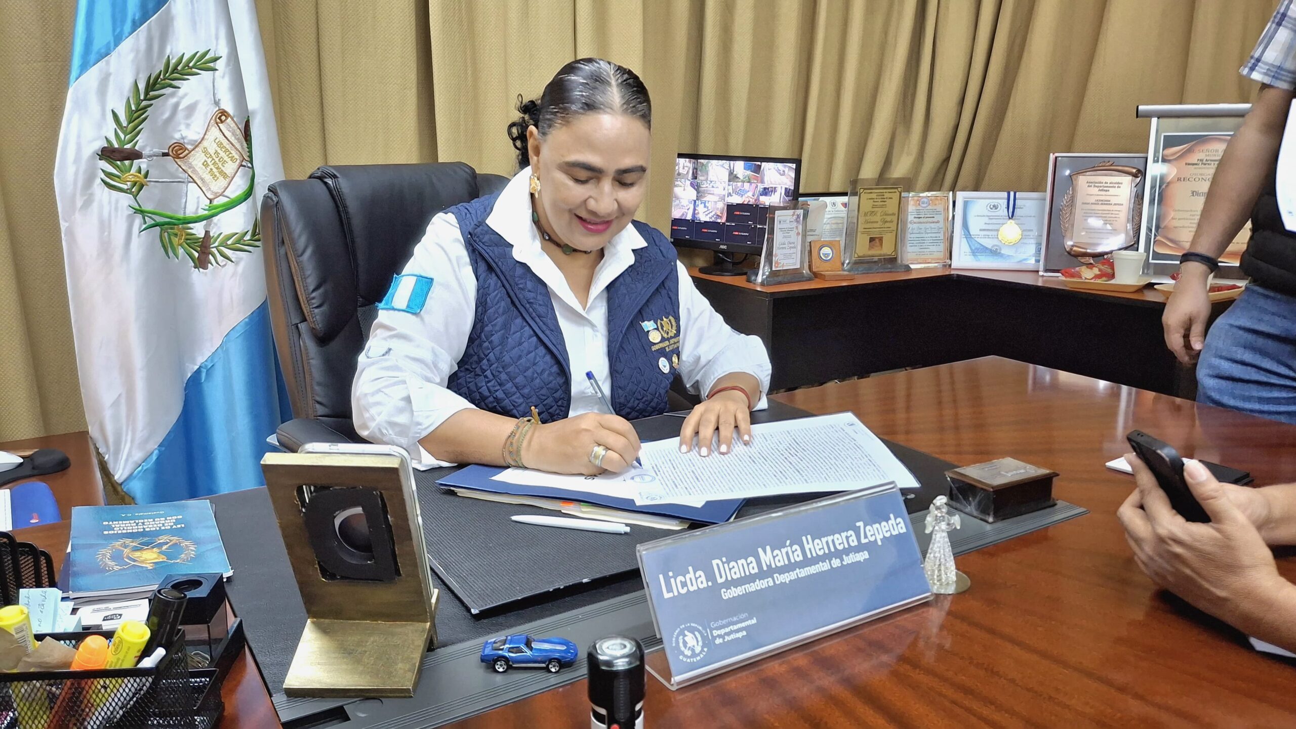 La presidenta del Consejo Departamental de Desarrollo de Jutiapa, Diana Herrera Zepeda, firmo el convenio juntamente al Señor Alcalde municipal de Quesada, Carlos Arrivillaga, y Presidente del Consejo Comunitario de Desarrollo Don Gerson Eladio López Retana de la aldea el Jocote. El mejoramiento de la Calle Rural Kuwait ubicada en la aldea El Jocote del municipio de Quesada, Jutiapa.